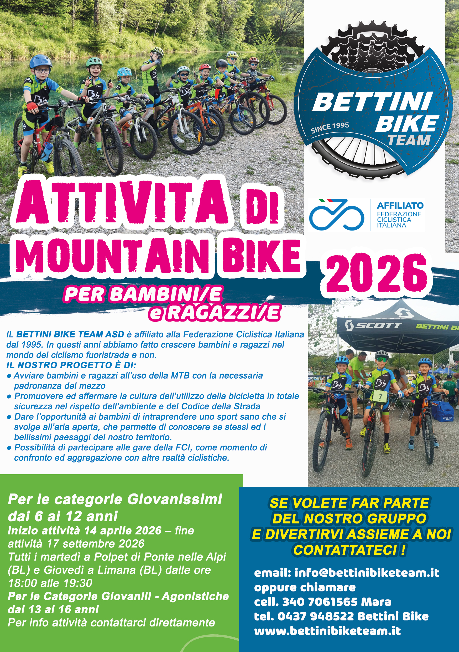 La ASD BETTINI BIKE TEAM è affiliato alla Federazione Ciclistica Italiana dal 1995. In questi anni abbiamo fatto crescere bambini e ragazzi nel mondo del ciclismo fuoristrada e non.